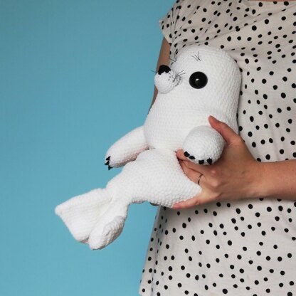 The body is made in chunky chenille-type fluffy yarn with a 4mm hook, with the 4-ply cotton details added over the top. Made in matching yarn and hook the finished seal will measure about 49cm/18in long.