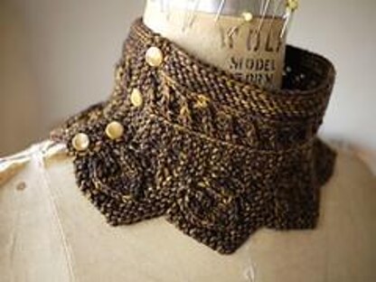 A ring of hazelnuts dusted with gold encircles the hem of this neckwarmer in three sizes (S/M/L) to knit with softly spun DK yarn. The piece features a buttoned closure and knits up in a hurry from a surprisingly small amount of yarn, making it a go-to solution for last-minute gifting.