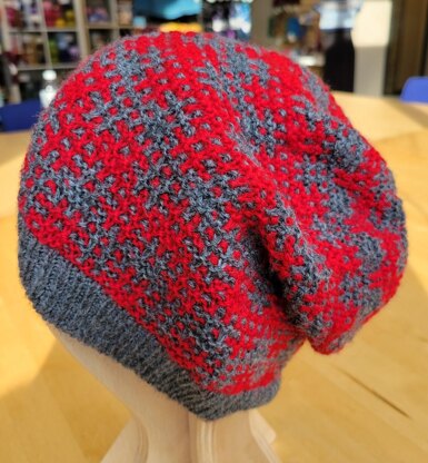 Hat is worked with some extra length for a slouchy look. It uses a fingering weight yarn which is a nice light weight yarn. 2 contrasting colors are used with high contrast.