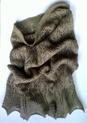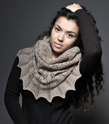 This elegant lace cowl is worked in the round, from the top down. Starting with a folded picot edge, the cowl increases in circumference as you work through the lace charts.