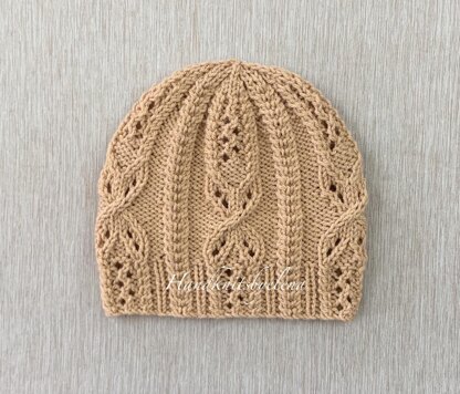 A combination of different cable and lace stitches in this hat creates a very pretty and unique design.