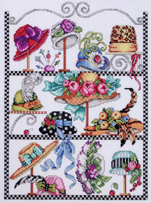 Designed by: Barbara Baatz Hillman. Wow them with chapeaus galore! Colorful, novelty hats stored neatly on checkerboard shelves at the ready for any occasion. Feather, fruit, and flower-festooned hats compete with THE RED HAT prominence in a "dressed-to-the-nines" world. Add one dainty, beaded hat pin for a night-on-the-town.\n