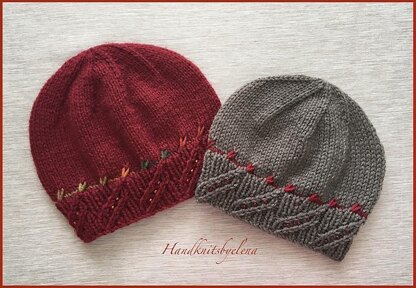 The border of the hat is knitted in a beautiful stitch that combines ribbing and cables. The pattern icludes both written instructions and a chart for the stitch. The "little leaves" motif is made using slipped stitches and simple cables.