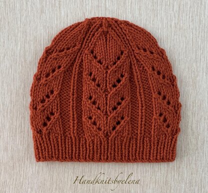 This hat is knitted in a very pretty lace stitch that looks like columns of lacy leaves. It's very easy and fast to knit! The pattern includes both written instructions and a chart for the stitch.