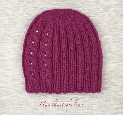 This pretty hat is made in the round and does not have a seam. The braids are shaped with simple cables, easy to knit!