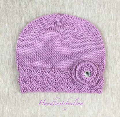 This pretty hat is made in the round and does not have a seam. The stitch on the border is shaped with simple cables. The pattern includes instructions for the knitted flower.