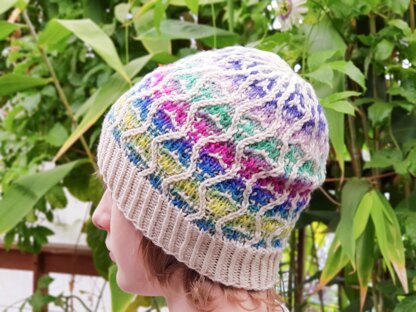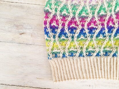 Hat Trick # 5 is the final in the Hat Trick Collection. It features a travelling slip stitch pattern, using two contrasting yarns, one solid colour and a variegated. Only one colour is used per round. It is a lot easier to work than it looks. Sizes: Newborn, Baby, Child, Small, Medium, Large, XL To fit head circumference up to: 40 - 44 - 49 - 53 - 57 - 60 - 63 cm or 16 - 17.5 - 19.25 - 20.75 - 22.5 - 23.5 - 24.75 " Materials: DK Weight yarn in two contrasting colours Contrast Colour: 50- 50- 50- 50- 50- 50- 50 g in a variegated colour, about 300 m per 100 g Main Colour: 50 - 50 - 100 - 100 - 100 - 100 - 100 g in a solid colour, about 300 m per 100 g Yarn Suggestion: King Cole Riot DK ( Variegated) and King Cole Panache DK ( Solid)