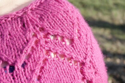 Havtorn (sweater/pullover/jumper) is chunky yet an elegant and fun design with a loose comfy form, knitted top down with a round yoke. The yoke is decorated with a lace pattern, cable stitch and an elongated stitch that adds a little flair to the design.