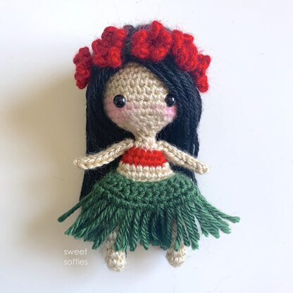 This doll pattern is a variation of Sweet Softies’ Baby Bean Doll. To make the Hawaiian Hula Girl, you will also need pattern instructions for the Baby Bean doll base, available as a free pattern (search "Sweet Softies Baby Bean Doll Base" to find it). This doll’s PDF pattern file includes written crochet instructions for adapting the Baby Bean doll base to create this design. It includes step-by-step photo references and a detailed hair tutorial.