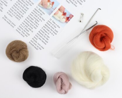 Instructions, 2x felting needles, range of British Breed and/or Merino wool, brooch back.