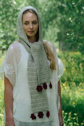 A garter and drop-stitch hooded scarf to wrap you up and keep out the cold. Finished off with a floral fringe.