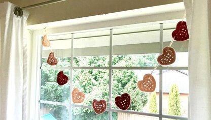You’ll need the yarn colors pictured (worsted weight) or any color of your choice, a size E crochet hook, a yarn needle, a beginning to intermediate crochet skill level. The finished hearts are about 3 1/2” wide and the garland pictured is about 60” long.