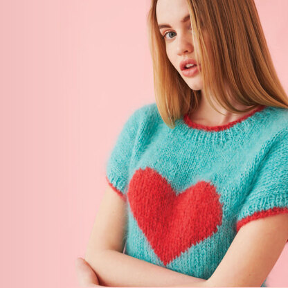 This adorable Heart Sweater will certainly fill your heart with knitting joy! If you are new to intarsia, this is a fabulous project to learn with because it is one solid motif in chunky yarn. The little contrast row in the ribbing around the neck and sleeves is super sweet and makes the central heart pop! Knit flat and seamed.