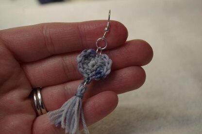 Have fun with these delicate heart tassel earrings! The pattern works up easily with sock yarn scraps (size 3 crochet thread works well also) and earring findings. Perfect for that last little bit of beautiful hand dyed yarn that you can’t bear to let go to waste in your stash! You can assemble using fishhook earring wires or flat back posts and glue. Jump rings are optional additions to give them a more dangly swing.