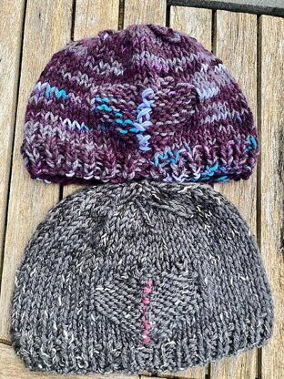 I’ve chosen a double-stranded, washable and affordable, double-knit yarn for this super easy hat, to give a "super chunky" gauge. You could use any yarn you like if it meets the gauge. The hat has a simple contrasting stitch heart on the front and back. The hat is knitted flat and visibly seamed, with one heart on the seam. The hat is designed to wordlessly communicate a “bad hair day”. Some people don’t like to talk about their feelings or just can't express their emotions. If you feel a bit like you need some kindness you can communicate that by wearing the seam at the front.