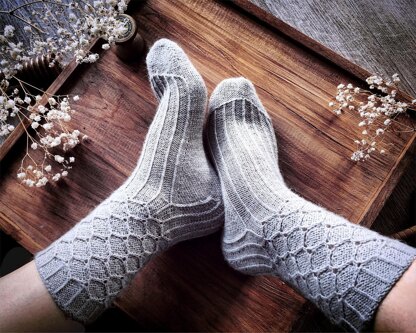 These socks are knitted toe-up. The pattern features a curved line on the toe, derived from ballerina shoes. The foot is made with a gusset and a heel flap construction. The lace pattern on the leg was inspired by the form of an artichoke, as well as each petal.