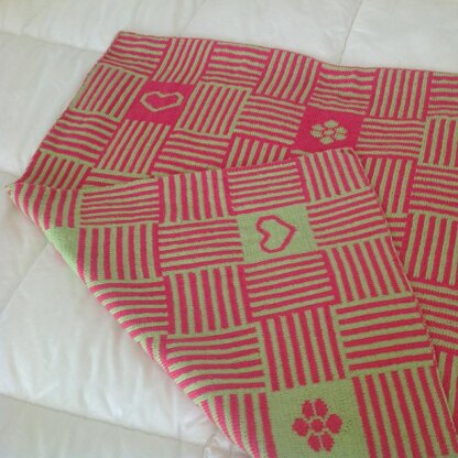 Thick, warm, soft and cosy, this reversible cot blanket is double-knitted in one piece in 4 ply wool. The pattern of vertical and horizontal stripes creates a basket-weave effect and you could fill the nine central squares with any image you can think of (it need not be the hearts and flowers I’ve used here).