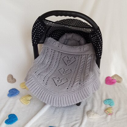 This is a carseat blanket to match my Cable and Lace cot blanket, featuring similar elements - cables, lacey hearts and pleated border which is knitted separately and then sewn on.