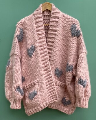 A super chunky, oversized balloon sleeve cardigan with random hearts - knitted in one piece with the sleeves picked up from the body edges. Twisted rib creates a cosy edge and there are two large pockets on the front,, There is no sewing up required. Choose from 2 sizes and add hearts, or leave them off for a plain cardigan.