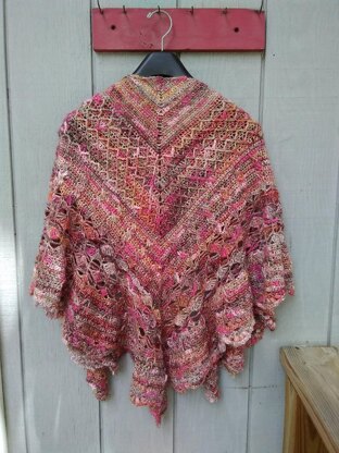 This is a triangle shawl. It is worked top down and slightly curves around the shoulders. In the photo's you'll see I've made this in two different yarns. The one with each section a different color, I used Queensland United Lambswool and cotton blend, fingering weight yarn. The other I used Queensland Uluru cotton, acrylic, poly blend, fingering weight yarn. I used a larger hook to give the shawl a nice drape. You can use any yarn and weight you prefer.