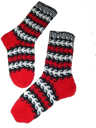 Here’s a sophisticated spin on a heart motif, showing a heart full of nooks and crannies, in which our love is complicated and abstract, with little crooks that reach out to one another. This women’s sock pattern uses a Turkish stitch pattern called “Heart’s Crook", but not the traditional Turkish sock design. Instead, its short row heel and toe and cuff down approach blend Western and Eastern sock construction technique and pattern in a single design.