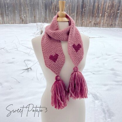 The hearts that adorn the angled ends of the scarf are crocheted right into the pattern, no need to add appliques after you are done.
