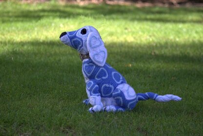 Using DK yarn produces a dog approx 36cm tall. Any yarn may be used as long as an appropriate hook is selected, although size and yarn quantities required will change.