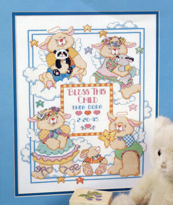 By Kooler Design Studio. PDF Download - Five adorable Heavenly Angel Bunnies flutter around the center of this design which declares the arrival of another “angel” baby. This baby birth record is so sweet you have to smile when you see these little charmers flying in the clouds.