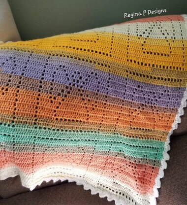 This filet style baby blanket is a repeat pattern of 22 rows. Created using Mandala brand Pixie and Caron Simply Soft Party in white for the border, this blanket works up to be approximately 32" wide by 41" long depending on your yarn choice and tension.