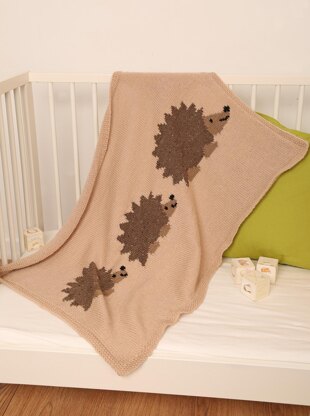 This blanket is knitted in one piece from the bottom up, with a moss stitch border knitted as the rest of the blanket is worked, allowing for minimal finishing. The hedgehogs are knitted into the blanket using the intarsia technique; the facial features can either be knitted in, or added at the end using duplicate stitch.