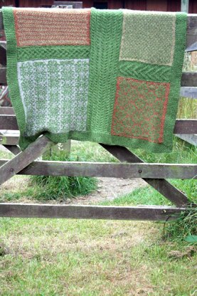 Using design elements from the other patterns in Dovestone Smallholding collection, four colourwork fields and three cabled hedgerows are each knit separately. Later the seven pieces are joined and a moss stitch border is picked up to add a lush green edging.