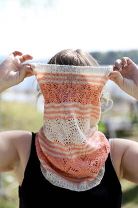 Heinä is a light and mellow little cowl project. It uses a linen blend in two colors and plays with stripes and different lace patterns.