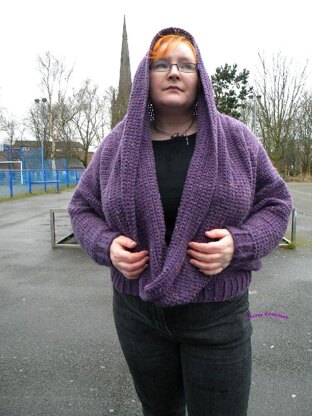 This cosy sweater is top down construction, the sleeves are joined as you go as is the cowl, there is minimal seaming along the sides. The cowl is large enough to use has a hood and has a soft, warm feel.