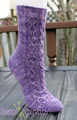 Heliotrope is worked from the cuff down and features a simple, delicate cable design down the front of the leg and foot of each sock. The cable is set against a ribbed pattern and is reminiscent of lattice in a garden.