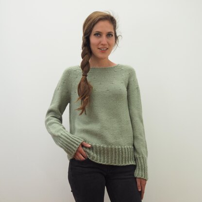 HELLE is worked seamlessly from the top down. The rounded yoke is shaped by (k1, yo, k1) into the same stitch. Hem and cuffs are worked with twistet stitches.