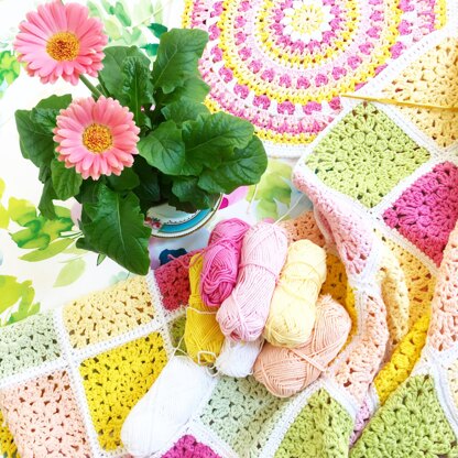 You will find the patterns for the mandala, cushion, one colour square, multi colour square and the blanket, all included.