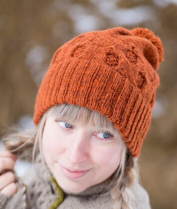 Helmi is a warm and cozy beanie with cable details and a pom pom to top it off.