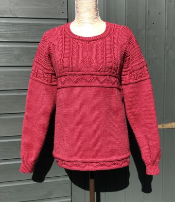 A beautiful sweater with more than a hint of gansey stitchery - including ropes, twists, ladders and tree of life. The main parts are worked in stocking stitch with a pretty zig-zag border at the lower edge framed by a reverse stocking stitch rouleaux. The sleeves are worked top down, making it easy to adjust the length if desired, the rest is worked bottom up. Full written instructions given.