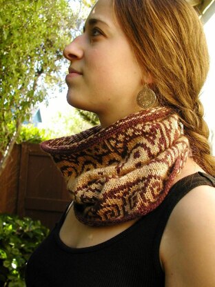 This cozy cowl has a different pattern on each side, both made to resemble the intricate patterns used in henna tattoos.