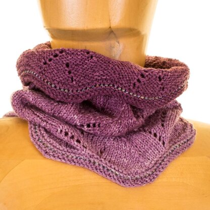 Although this shows off gradient yarns especially well, it also looks great in a solid or semi solid sock yarn. As written it used around 200-250 yards, but the height can easily be adjusted to maximize your yardage. The lace pattern is easy to memorize, and only uses 3 different stitches - yo, k2tog, and ssk, making this a very good first lace project. The optional beads are added on the top and bottom edges, and really help emphasize the curving lines of the cowl.