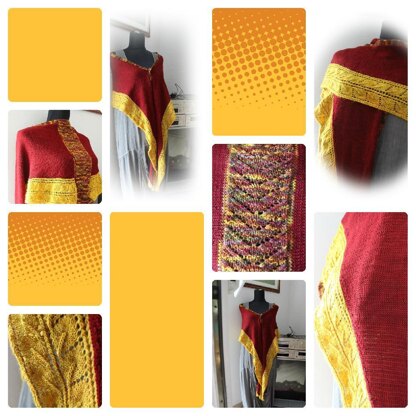 Ein Tuch, in den Farben des Herbstes, gestrickt in drei Teilen. Schön groß und kuschlig, dabei nur 233 gr. schwer. Ich habe dieses Tuch mit Wollmeise Pure, Madelinetosh und einem handgefärbten Sockengarn gestrickt. Es kann aber auch mit jeder anderen Wolle gestrickt werden. Die Teststrickerin hat Wolle von Lang verwendet. Eine Maschenprobe ist nicht erfoderlich.
