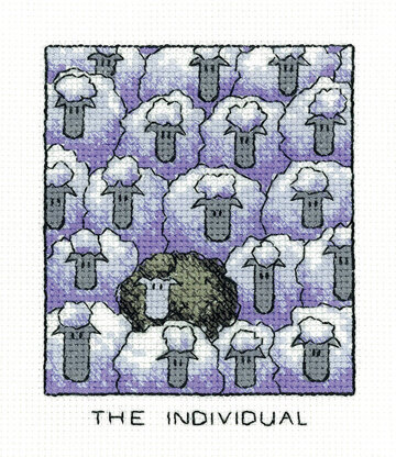 Your kit contains chart and instructions, needle, 14 count Aida fabric and presorted DMC stranded cotton threads on two loaded thread organisers. The Individual is a lone black sheep standing amidst his white companions.