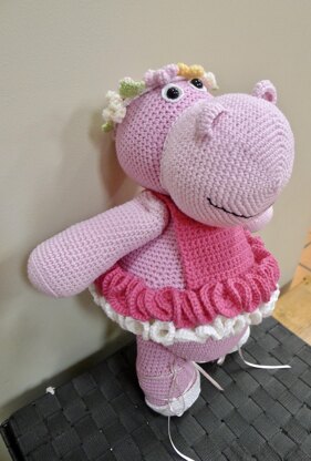Hermione is a gorgeous pink hippo. She is all set for a twirl in her lovely pink tutu and her dancing slippers. On her head she has a lovely wreath of flowers which she may well eat if she gets a bit peckish. Hermione is a chubby hippo, just perfect for cuddling. She is 40cm high and takes quite a bit of fibre filling to give her the desired shape. If making for a very small child I would be inclined to embroider the eyes on instead of using safety ones and possibly forgo her floral head piece which is not stitched on. Take your time when making this delightful project and you will be just tickled pink with the result. This is not a beginner project but if you have made other amigurumi projects you won’t find Hermione to much of a challenge