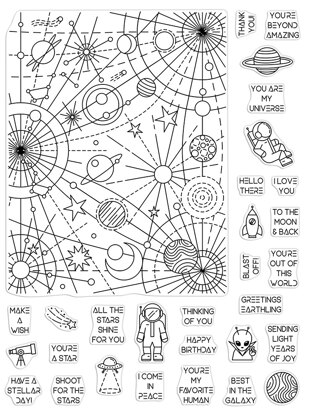 These clear stamps peel off their backing and stick to any acrylic block making for easy stamping. Simply apply your favorite ink and stamp crisp clear images! They are made from 100% photo-polymer which is latex free, phthalate free and non- toxic. This package contains Galaxy Peek-A-Boo Parts: a set of 28 stamps on a 6x8 inch backing sheet. WARNING: Choking Hazard. Not suitable for children under 3 years. Made in USA.