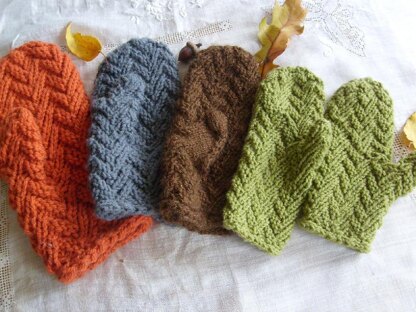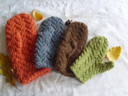 The Herringbone Mitten is knit on the bias in three repeats, increasing near the wrist, decreasing and using short rows near the fingertips to shape the top of the mitten. When the knitting is done, the provisionally cast on edge is grafted in pattern to the last row, leaving a long slash for the thumb stitches.