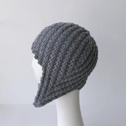 This unique ear flap hat uses a ribbed pattern to create a large chevron pattern. This hat knits from the bottom up. Earflaps are knit first and then attached together with a cast-on brim, which then knits much like a traditional hat.