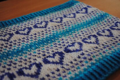 This sweet cowl is an addicting colorwork project featuring large open hearts surrounded by single knit stitches in colorwork- designed to look like mini hearts!