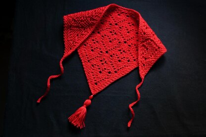 This is an intermediate Tunisian crochet lace pattern for a triangle-shaped bandana with ties. It is built from the tip at the bottom and it grows with each row.