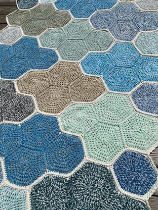 I doubled a worsted/aran weight acrylic and used an L (8.0 mm) hook. As a stashbuster, I gathered all available yarn in shades of blue, green, gray, beige and cream. Love the marled effect of the doubled yarn. Attached four hexagons as pictured and bordered with a round of cream colored single crochet. For 4 hexagons of the same two-color scheme I used about 100g of each of two colors.