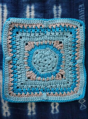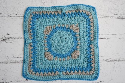 This 12” (30.5 cm) square starts with a hexagon. Crossed double crochet and popcorn stitches add texture.